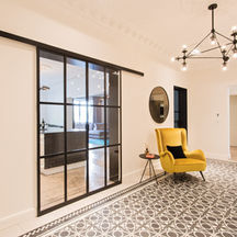 Auffällig und passgenau in die Raumsituation integriert wirkt auch der Windfang, der den Flur mit dem hinteren Wohnbereich verbindet. Es wurde ganz bewusst darauf geachtet, dass die schwarzen Rahmenprofile direkt in den Stuck eingearbeitet wurden, um einen scheinbar nahtlosen Übergang zu wahren. Schwarz-Weiß geht auch hier wieder eine spannende Verbindung ein - und es sind wie immer die Details, die für Feinschliff sorgen.